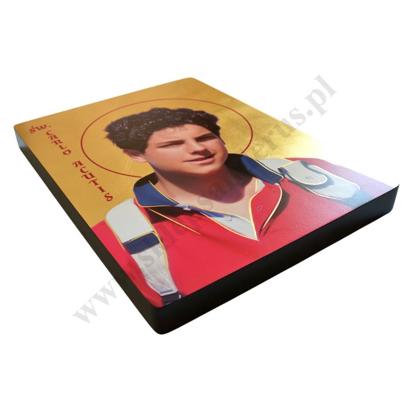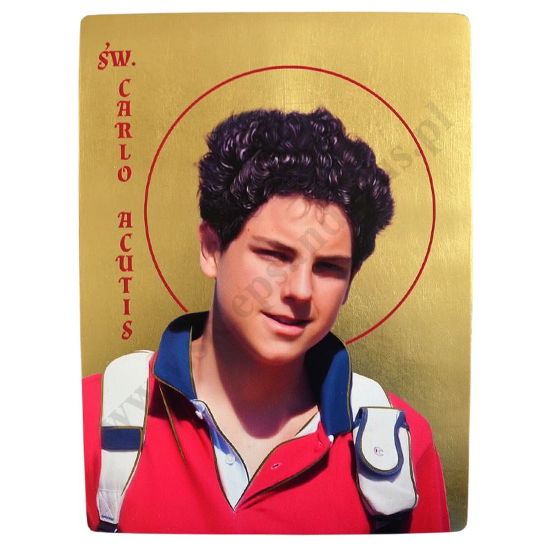 Ikona przedstawia wizerunek Świętego Carlo Acutisa w formacie 29 x 39 x 3.4 cm. Drewno wykorzystywane do produkcji ikon dobierane jest w niezwykle staranny sposób. Wizerunek naniesiony na ręcznie złoconą deskę.
