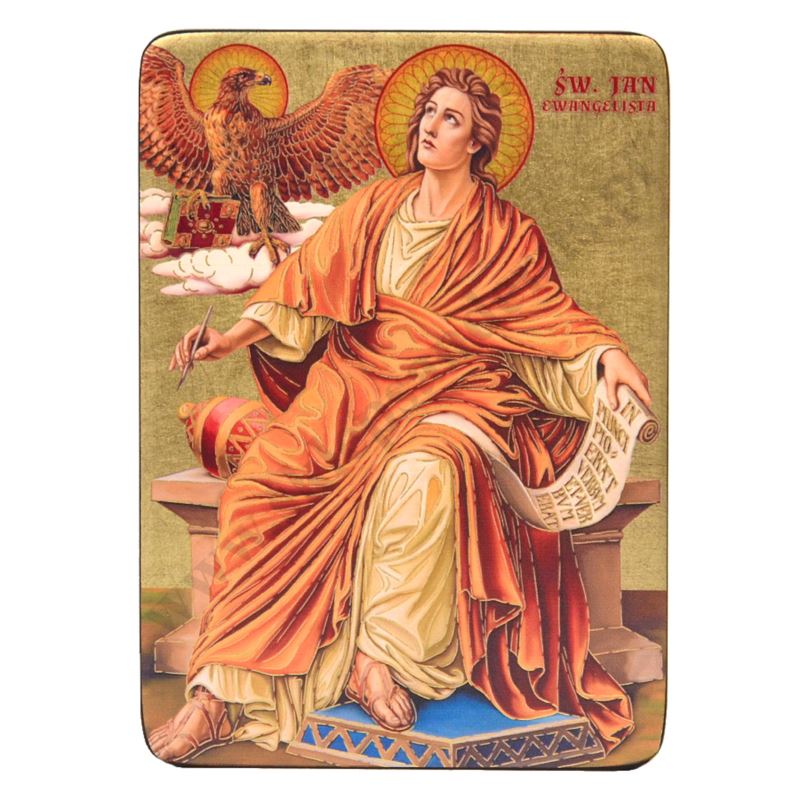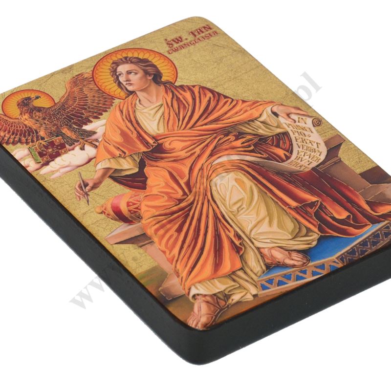 Ikona Św. Jan Ewangelisty o wymiarze 12 x 16.5 cm i grubości 2 cm. PONIŻEJ W PRODUKTACH POWIĄZANYCH ISTNIEJE MOŻLIWOŚĆ ZAMÓWIENIA OKAZJONALNEJ DEDYKACJI NA TABLICZCE SREBRNEJ LUB ZŁOTEJ