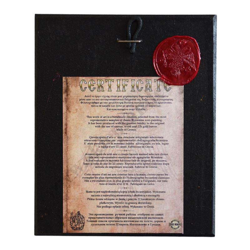 Ikona przedstawiająca wizerunek Św. Michała Archanioła o wymiarze 10.3 x 12.5 cm. Ikona ręcznie wykonana na płótnie lnianym wklejonym w drewno. Tło ikony jest wykonane ze sproszkowanego złota. Grubość deski 1.5 cm.