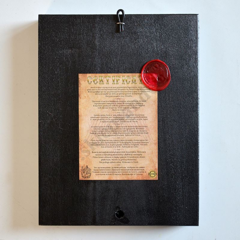 Ikona przedstawiająca wizerunek Świętego Michała Archanioła w wymiarze 18 x 23.5 cm. Ikona ręcznie wykonana na płótnie lnianym wklejonym w drewno. Tło ikony jest wykonane ze sproszkowanego złota. Grubość deski 2.3 cm. Ikona do powieszenia jak i postawienia.
