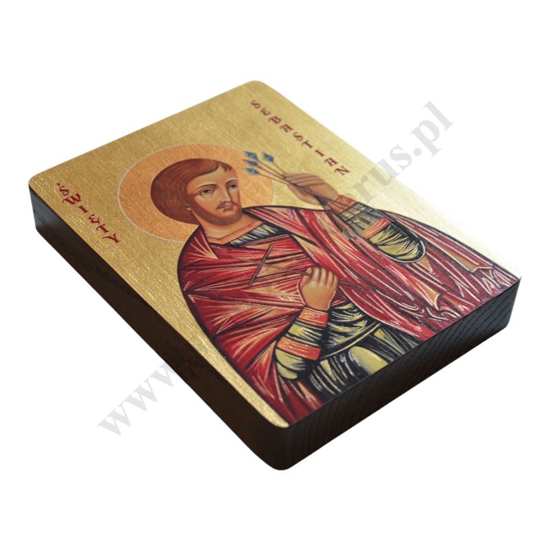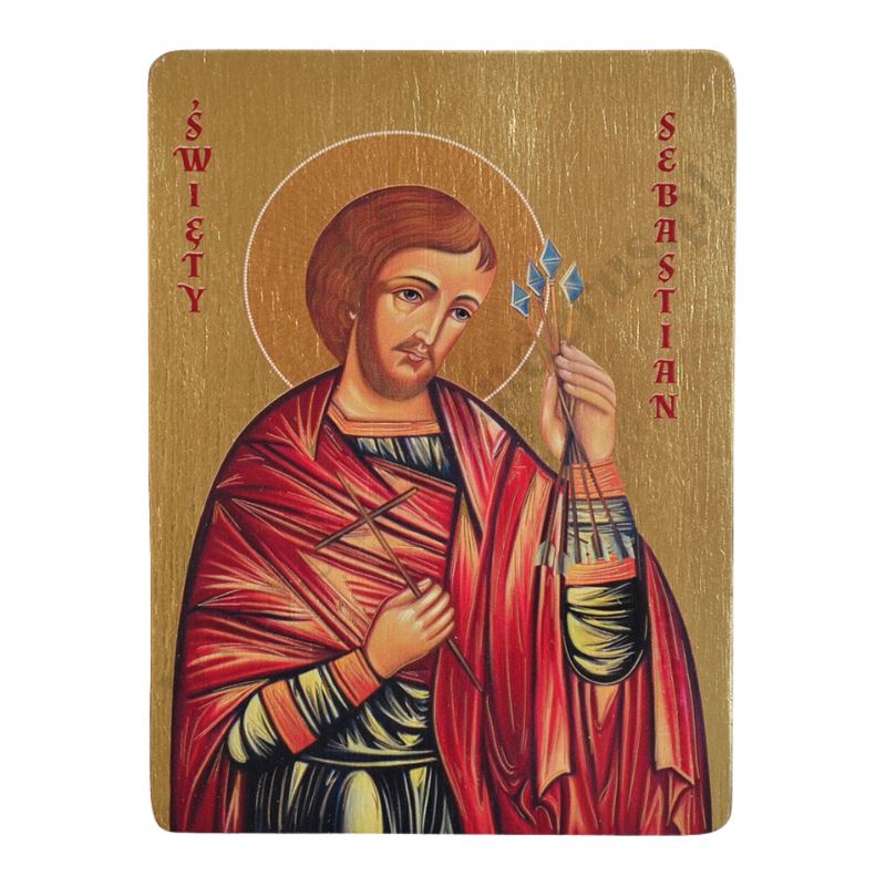 Ikona przedstawia wizerunek Świętego Sebastiana w formacie 12 x 16 x 2.3 cm. Drewno wykorzystywane do produkcji ikon dobierane jest w niezwykle staranny sposób. Wizerunek naniesiony na ręcznie złoconą deskę.
