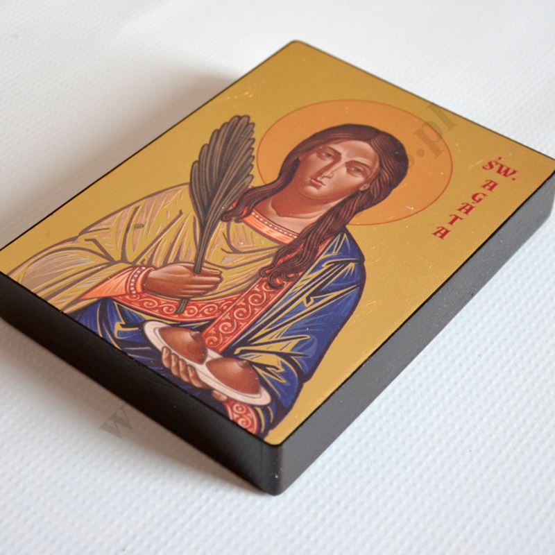 Ikona przedstawiająca wizerunek Świętej Agaty o wymiarach 11.9 x 16 cm, grubość deski 2.4 cm. Ikona z możliwością powieszenia lub postawienia.