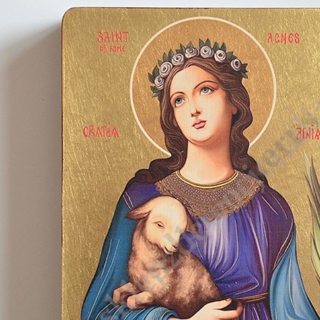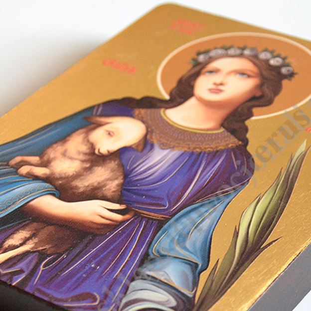 Ikona Świętej Agnieszki o wymiarze 12 x 16 cm i grubości 2 cm. PONIŻEJ W PRODUKTACH POWIĄZANYCH ISTNIEJE MOŻLIWOŚĆ ZAMÓWIENIA OKAZJONALNEJ DEDYKACJI NA TABLICZCE SREBRNEJ LUB ZŁOTEJ.