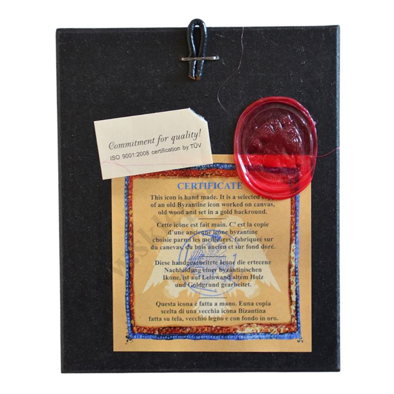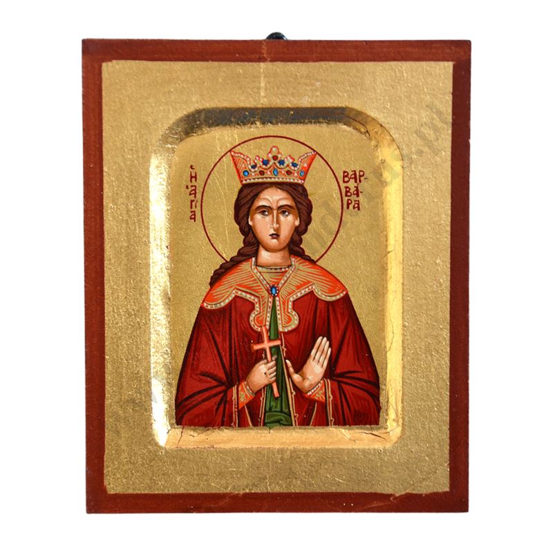 Ikona przedstawiająca Świętą Barbarę w wymiarze 10.2 x 12.4 cm. Ikona ręcznie wykonana na płótnie lnianym wklejonym w drewno. Tło ikony jest wykonane ze sproszkowanego złota. Grubość deski 1.7 cm.