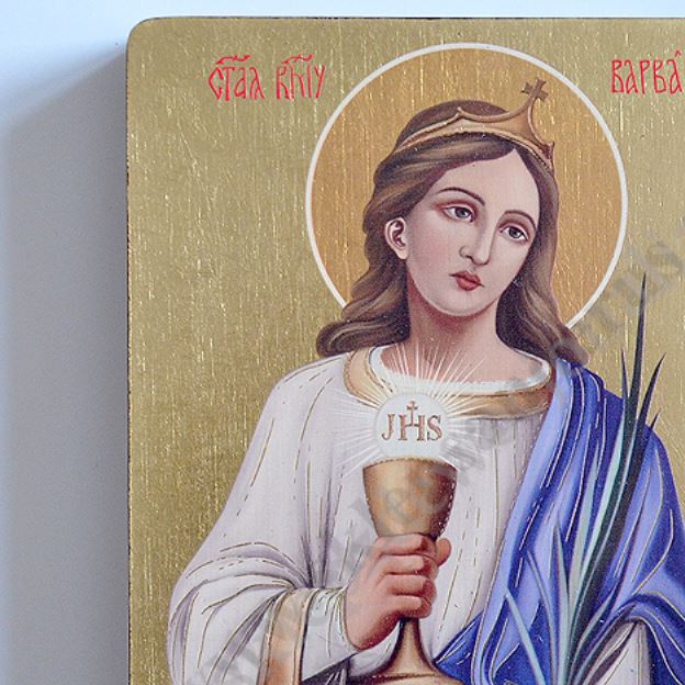 Ikona Świętej Barbary o szerokości 12 cm, wysokosci 16 cm i grubości deski 2 cm. Drewno wykorzystywane do produkcji ikon dobierane jest w niezwykle staranny sposób. Wizerunek naniesiony na ręcznie złoconą deskę. Produkt wspaniale sprawdzi się jako jedyny w swoim rodzaju upominek dla najbliższych.
