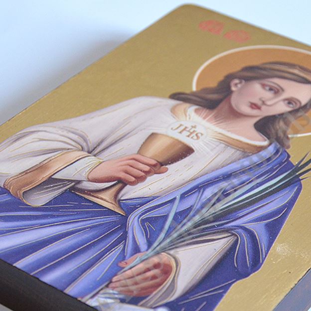 Ikona Świętej Barbary o wymiarze 12 x 16 cm i grubości 2 cm. PONIŻEJ W PRODUKTACH POWIĄZANYCH ISTNIEJE MOŻLIWOŚĆ ZAMÓWIENIA OKAZJONALNEJ DEDYKACJI NA TABLICZCE SREBRNEJ LUB ZŁOTEJ.