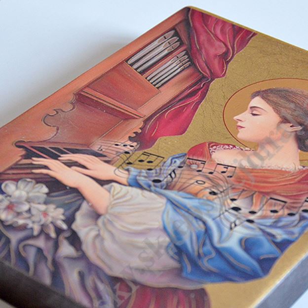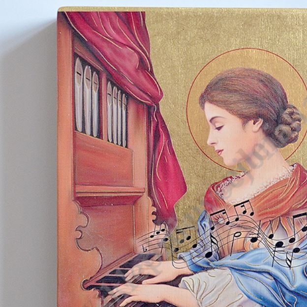 Ikona Świętej Cecyli o wymiarze 12 x 16 cm i grubości 2 cm. PONIŻEJ W PRODUKTACH POWIĄZANYCH ISTNIEJE MOŻLIWOŚĆ ZAMÓWIENIA OKAZJONALNEJ DEDYKACJI NA TABLICZCE SREBRNEJ LUB ZŁOTEJ.
