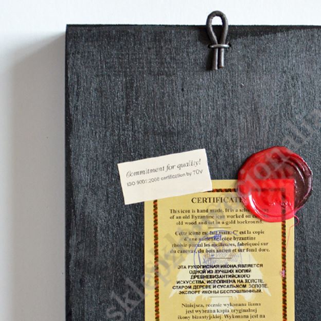 Ikona Świętej Moniki w wymiarze 14 x 18 cm. Ikona ręcznie wykonana na płótnie lnianym wklejonym w drewno. Tło ikony jest wykonane ze sproszkowanego złota. Grubość deski 2.3 cm. Ikona do powieszenia jak i postawienia.