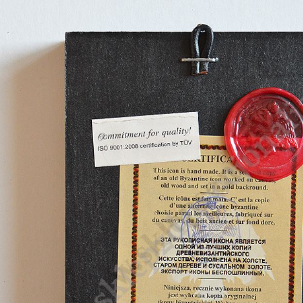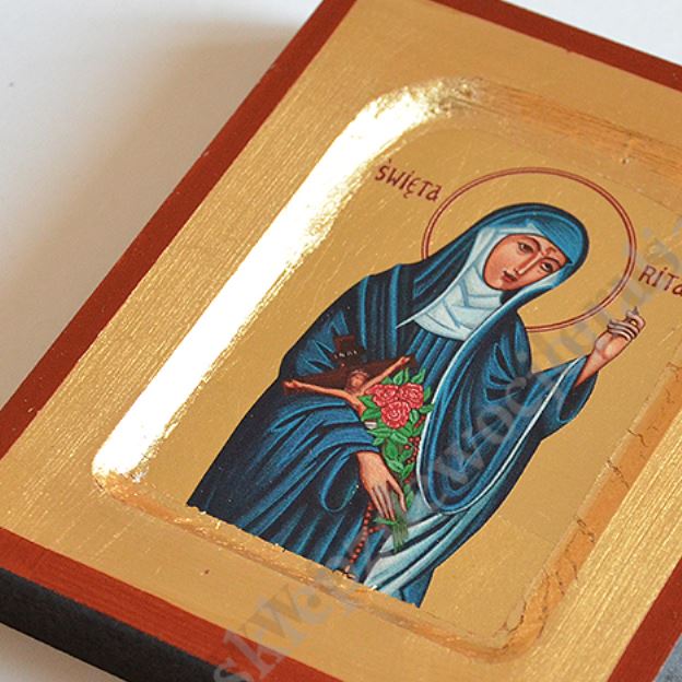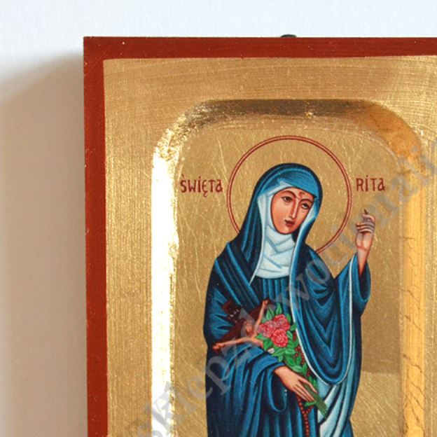 Ikona Świętej Rity w wymiarze 10.2 x 12.5 cm. Ikona ręcznie wykonana na płótnie lnianym wklejonym w drewno. Tło ikony jest wykonane ze sproszkowanego złota. Grubość deski 1.6 cm. Ikona tylko do powieszenia.