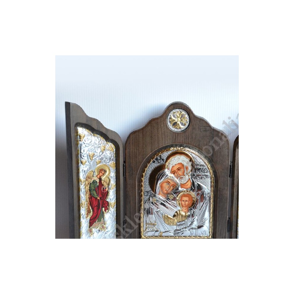 Replika ikon Świętej Rodziny i aniołów wykonane na przestarzałym drewnie i płótnie metodą sitodruku oprawione w specjalny, ozdobny stop PVD zawarte w drewnianym tryptyku. Szerokość otwartego tryptyku 33.5 cm, wysokość tryptyku 24 cm, szerokość zamkniętego tryptyku 16.2 cm.