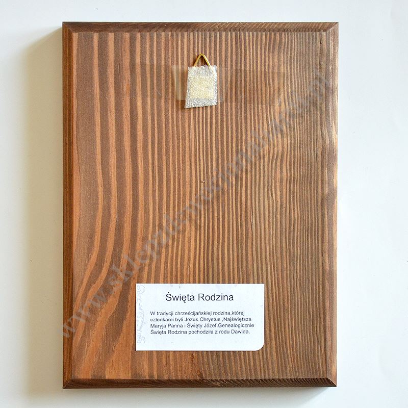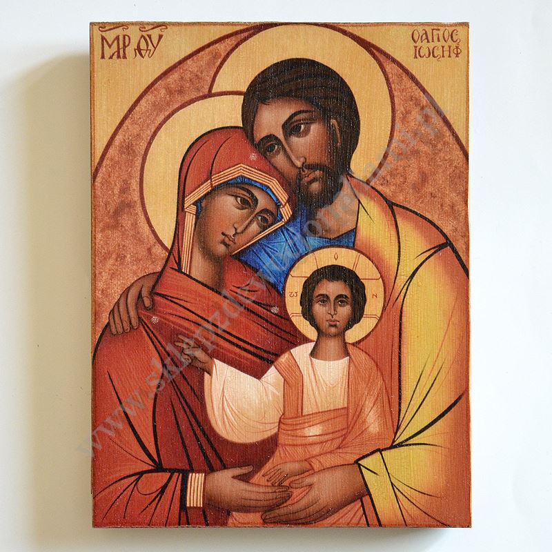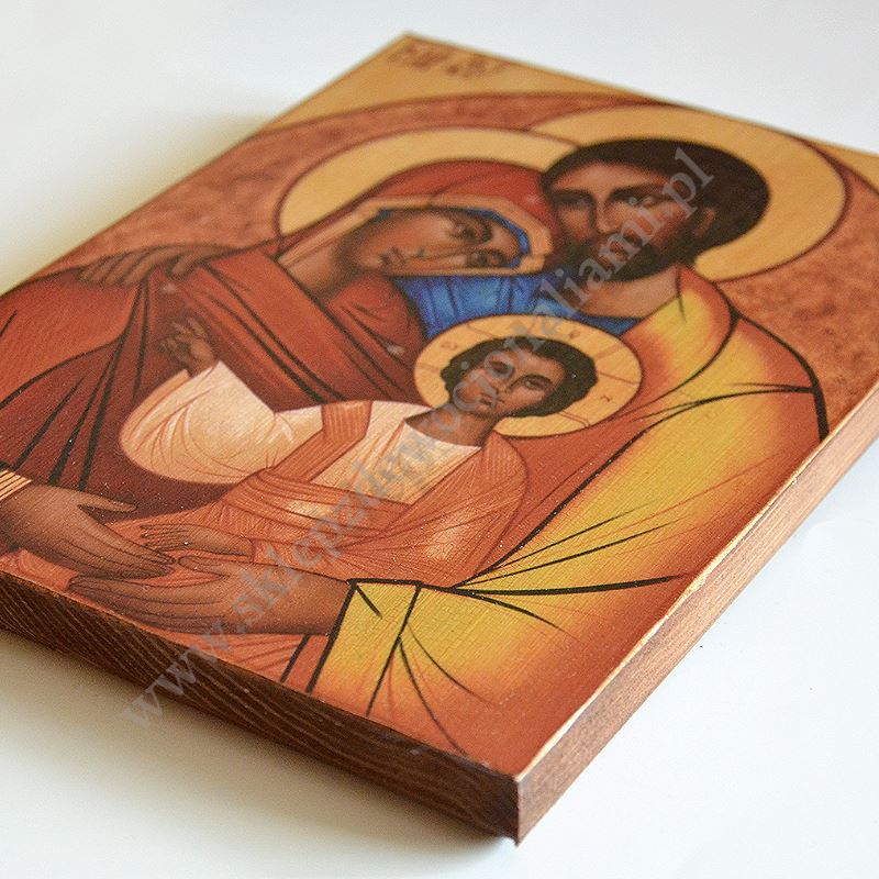 Ikona Świętej Rodziny o wymiarach 15 x 20 cm, grubość deski 1.9 cm. PONIŻEJ W PRODUKTACH POWIĄZANYCH ISTNIEJE MOŻLIWOŚĆ ZAMÓWIENIA OKAZJONALNEJ DEDYKACJI NA SPECJALNEJ TABLICZCE.