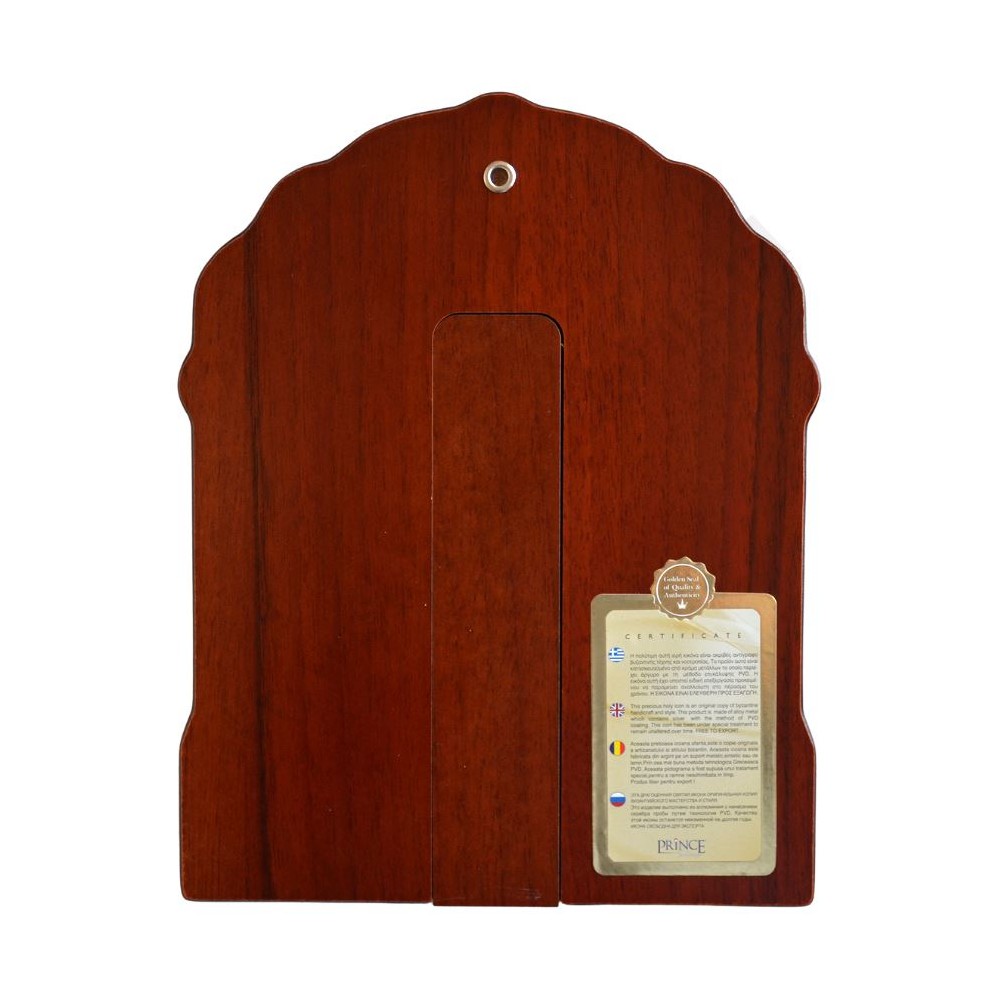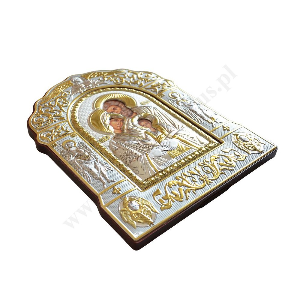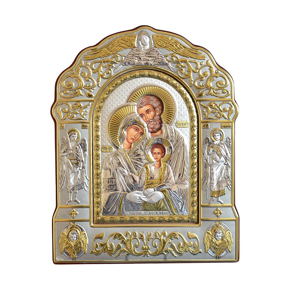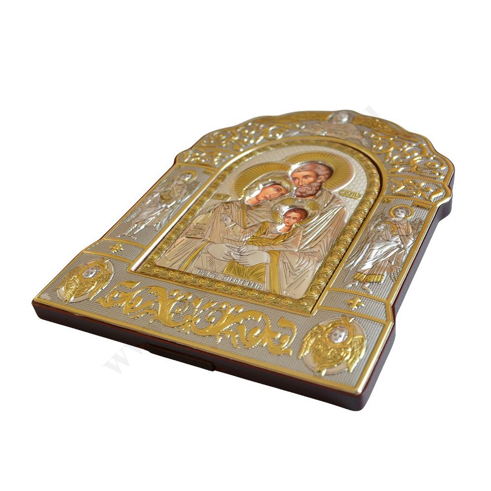 Ikona przedstawiająca Świętą Rodzinę o wymiarach 19.7 x 25 cm, wykonana techniką sitodruku w drewnie, oprawiona wytłaczanym stopem PVD ze srebrem i złotem, pokrytym specjalnym lakierem ochronnym.
