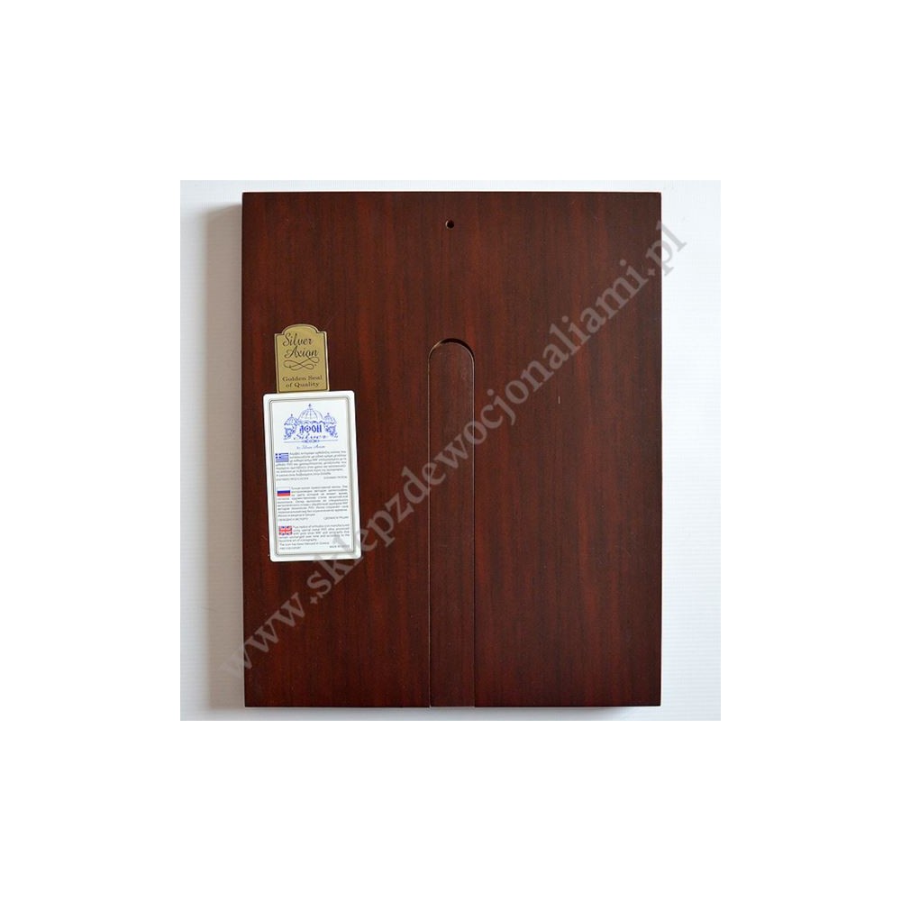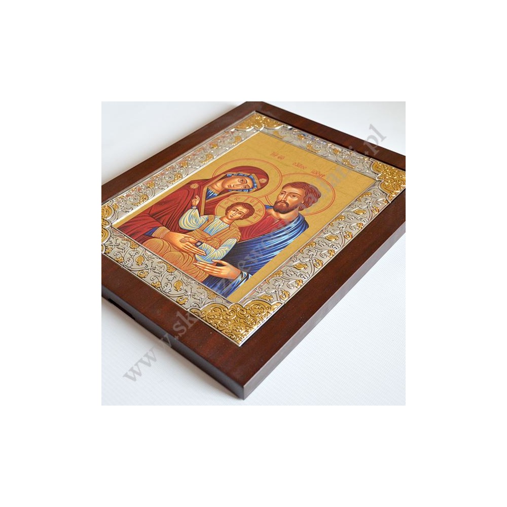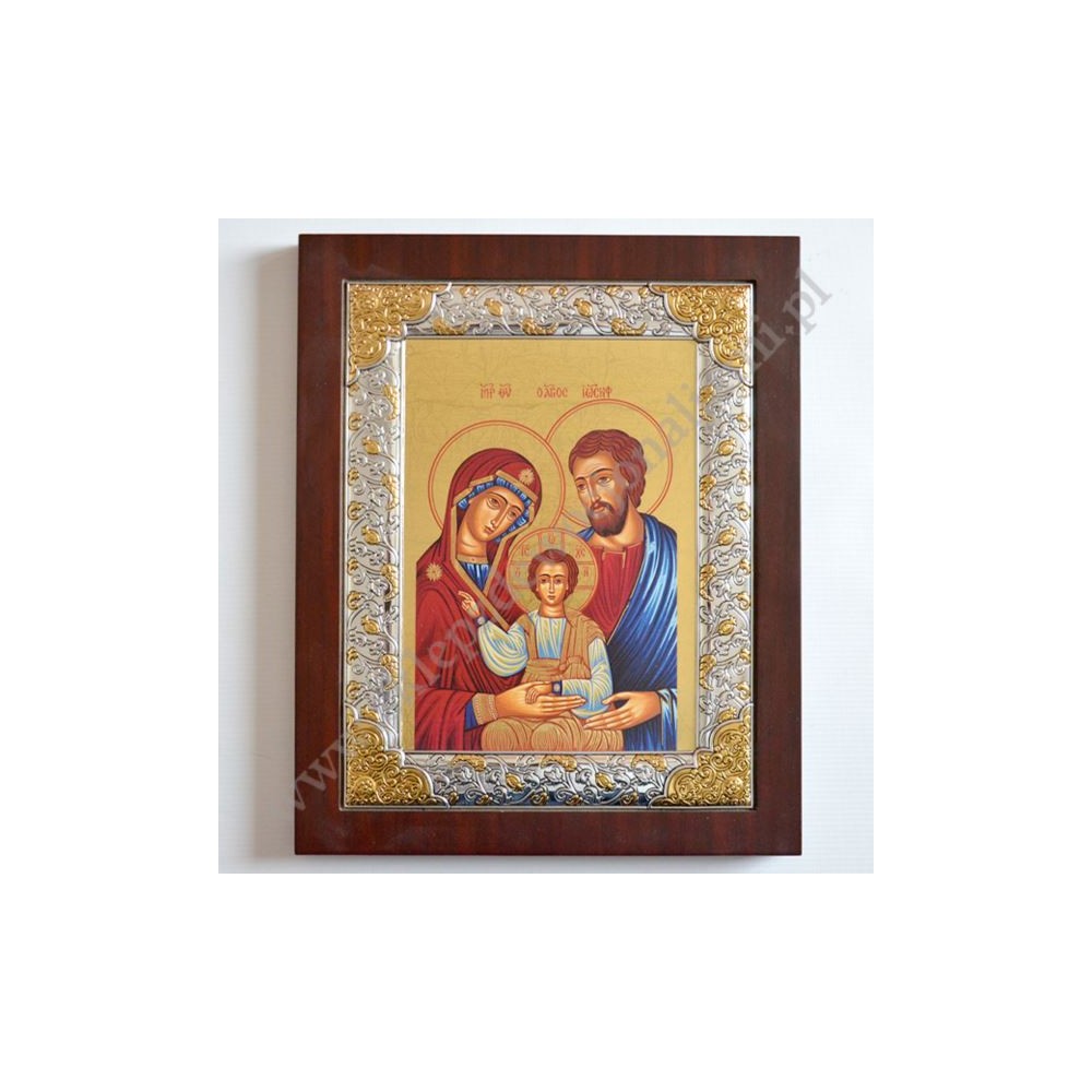 Ikona Świętej Rodziny wykonana techniką sitodruku w drewnie, oprawiona wytłaczanym stopem z naniesioną warstwą srebra, pokrytą specjalnym lakierem ochronnym. Szerokość ikony 28 cm , wysokość 34 cm, grubość 1.9 cm. Ikona z możliwością powieszenia i postawienia.