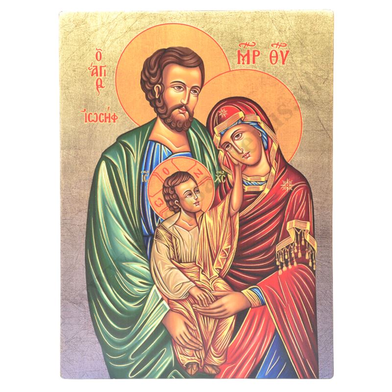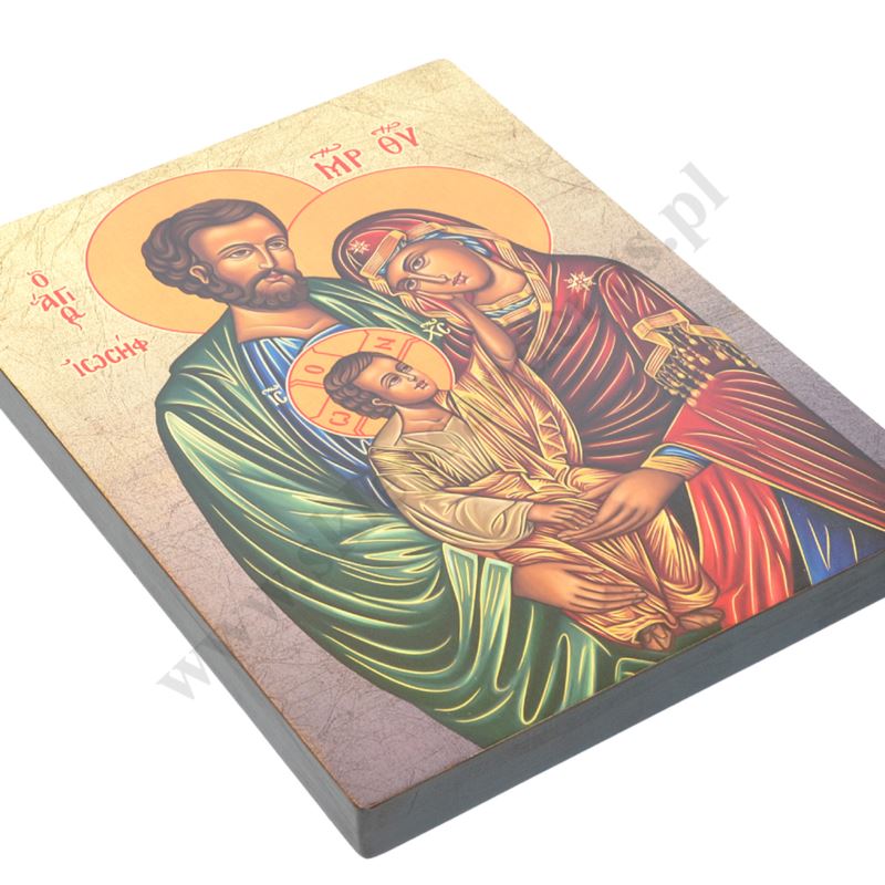 Ikona Świętej Rodziny o wymiarze 29 x 39 cm i grubości 3 cm. PONIŻEJ W PRODUKTACH POWIĄZANYCH ISTNIEJE MOŻLIWOŚĆ ZAMÓWIENIA OKAZJONALNEJ DEDYKACJI NA TABLICZCE SREBRNEJ LUB ZŁOTEJ
