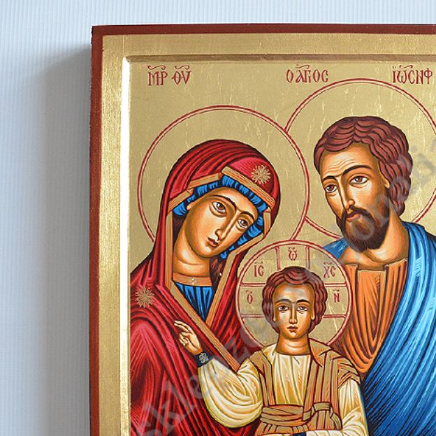 Ikona Świętej Rodziny w wymiarze 30 x 40 cm. Ikona ręcznie wykonana na płótnie lnianym wklejonym w drewno. Tło ikony jest wykonane ze sproszkowanego złota. Grubość deski 3 cm.
