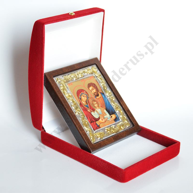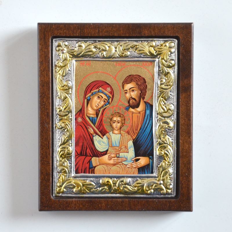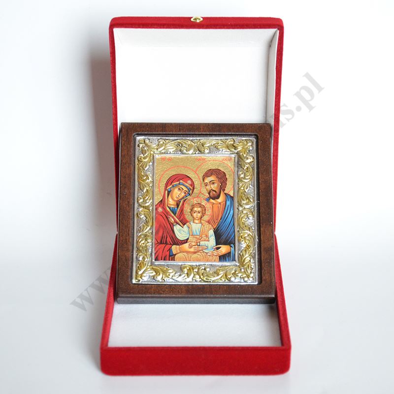 Ikona Świętej Rodziny wykonana techniką sitodruku w drewnie, oprawiona wytłaczanym stopem z naniesioną warstwą srebra, pokrytą specjalnym lakierem ochronnym.