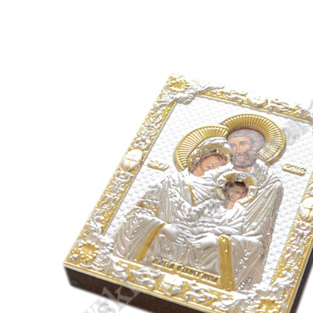 Okazjonalna ikonka Świętej Rodziny o wymiarach 9 x 11 cm, wykonana techniką sitodruku w drewnie i płótnie, oprawiona wytłaczanym stopem PVD ze srebrem, pokrytym specjalnym lakierem ochronnym.