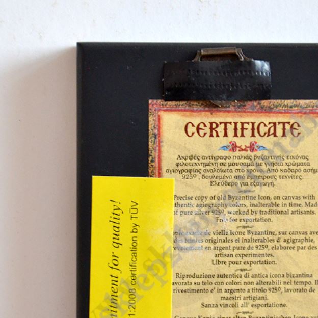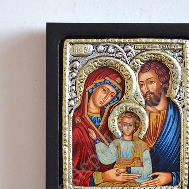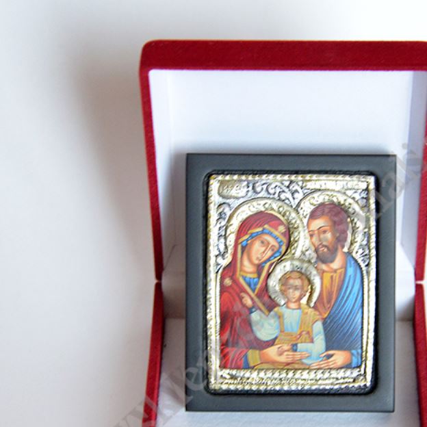 Okazjonalna ikonka Świętej Rodziny o wymiarach 6.2 x 7.6 cm, wykonana techniką sitodruku w drewnie i płótnie, oprawiona wytłaczanym stopem PVD ze srebrem, pokrytym specjalnym lakierem ochronnym. Ikonka dodatkowo zapakowana jest w eleganckie pudełko o wymiarach 8.5 x 9 cm.