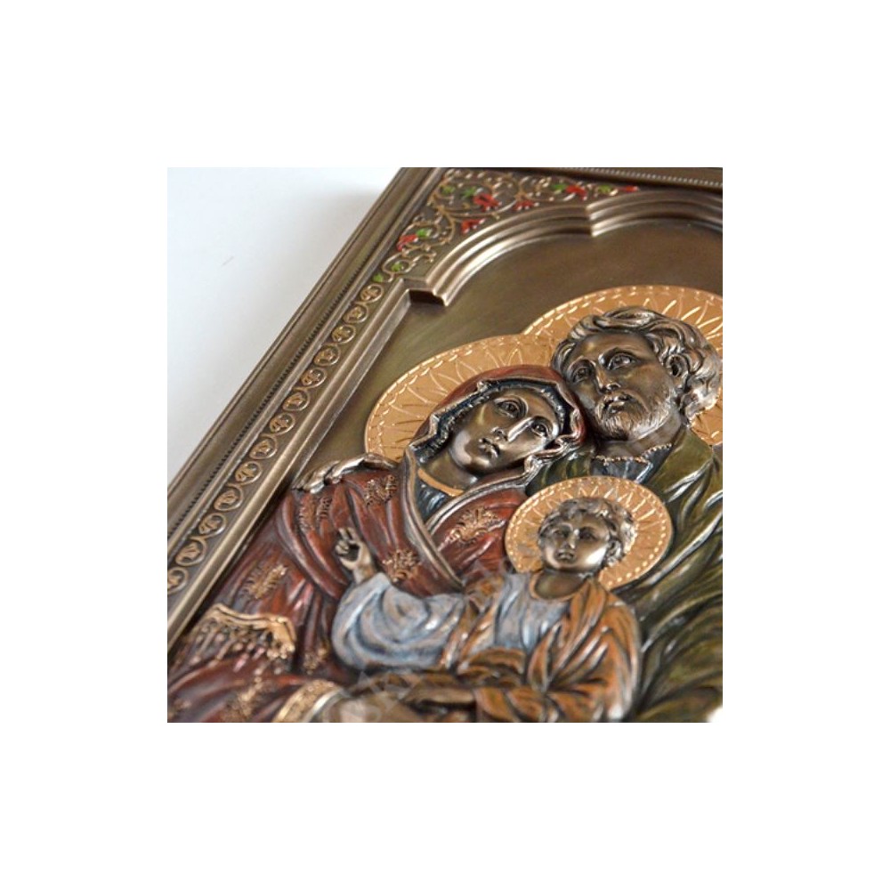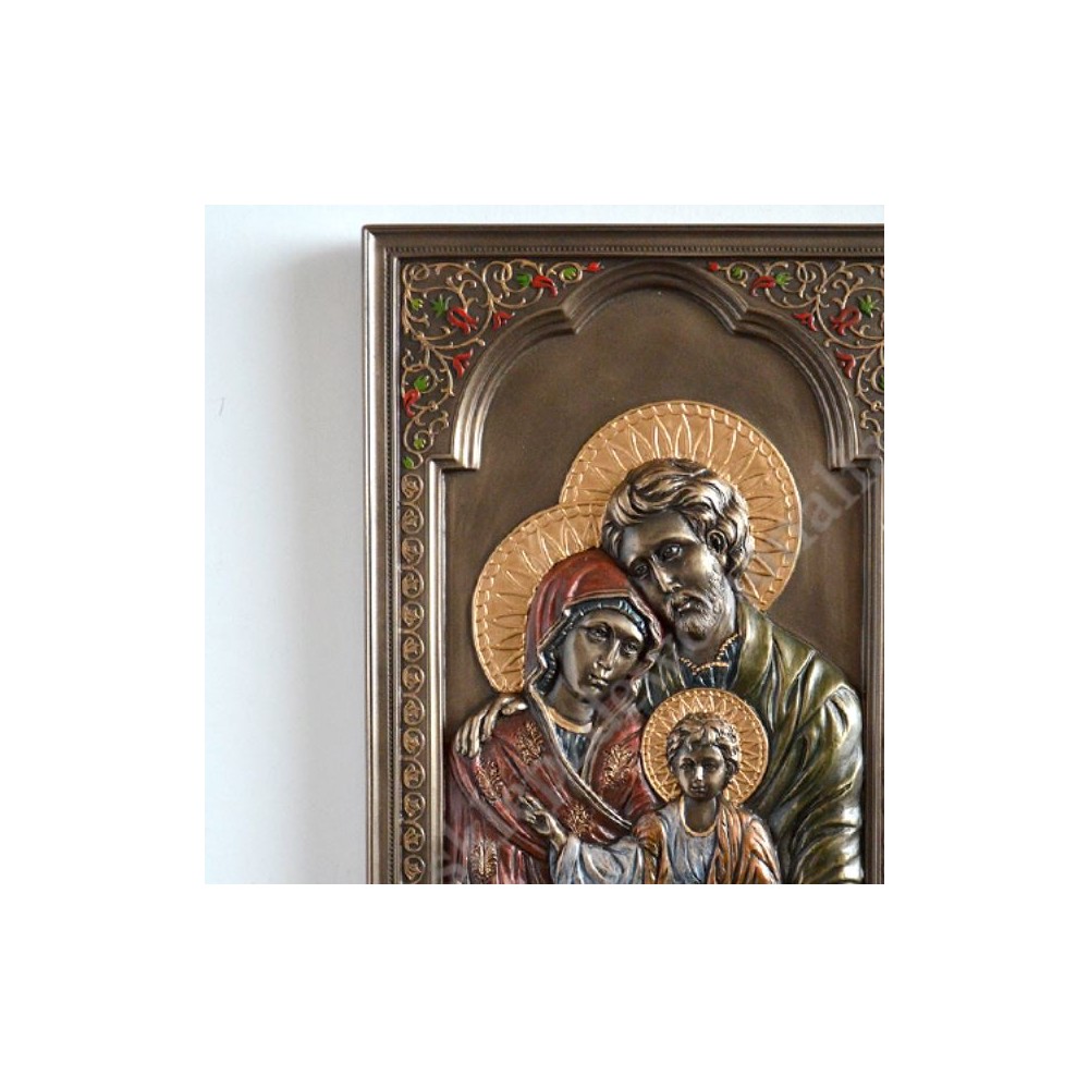 Płaskorzeźba Świętej Rodziny o szerokości 15.2 cm i wysokości 22.7 cm wykonana z poliresingu czyli konglomeratu żywicy, mączki alabastrowej i ceramicznej, pokryta brązem. Płaskorzeźba z możliwością tylko powieszenia.