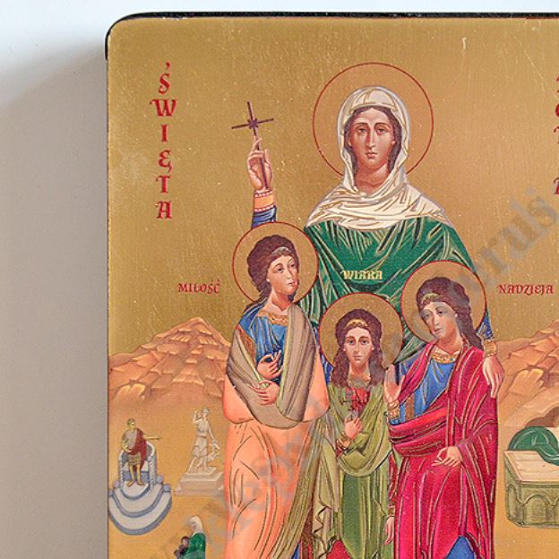Ikona Świętej Zofii o wymiarze 12 x 16 cm i grubości 2.5 cm. PONIŻEJ W PRODUKTACH POWIĄZANYCH ISTNIEJE MOŻLIWOŚĆ ZAMÓWIENIA OKAZJONALNEJ DEDYKACJI NA TABLICZCE SREBRNEJ LUB ZŁOTEJ.