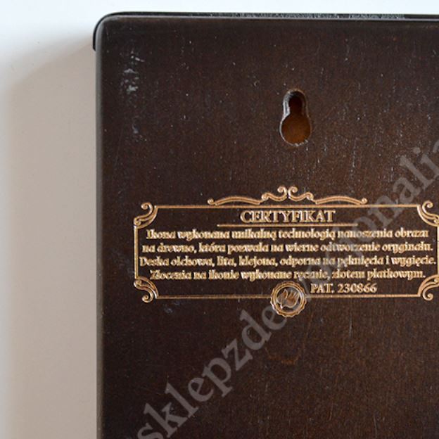 Ikona wykonana unikalną technologią nanoszenia obrazu na drewno, która pozwala na wierne odtworzenie oryginału. Deska olchowa, lita klejona, odporna na pęknięcia i wygięcia. Złocenia na ikonie wykonane ręcznie, złotem płatkowym.