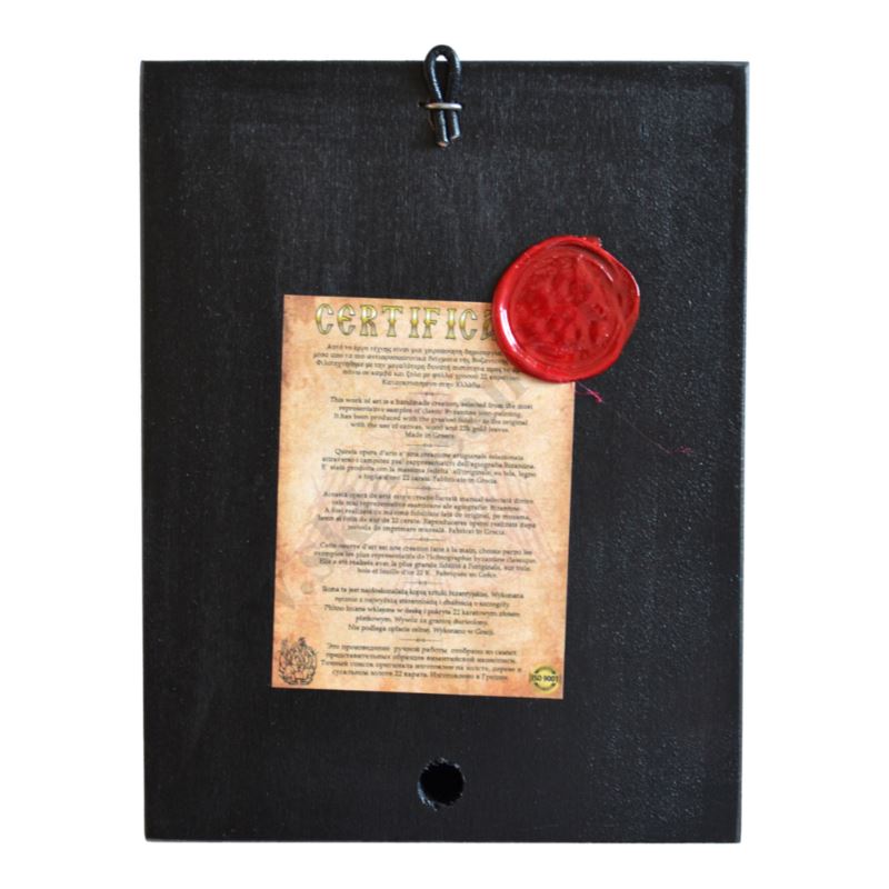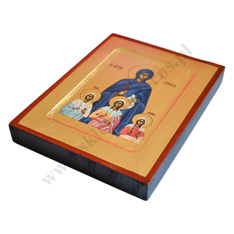 Ikona przedstawiająca Świętą Zofię w wymiarze 14 x 18 cm. Ikona ręcznie wykonana na płótnie lnianym wklejonym w drewno. Tło ikony jest wykonane ze sproszkowanego złota. Grubość deski 2.3 cm. Ikona do powieszenia.