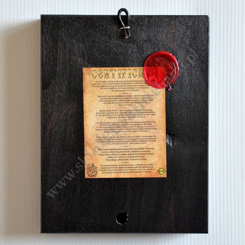 Ikona Świętego Antoniego w wymiarze 14 x 18 cm. Ikona ręcznie wykonana na płótnie lnianym wklejonym w drewno. Tło ikony jest wykonane ze sproszkowanego złota. Grubość deski 2.3 cm. Ikona do powieszenia jak i postawienia.