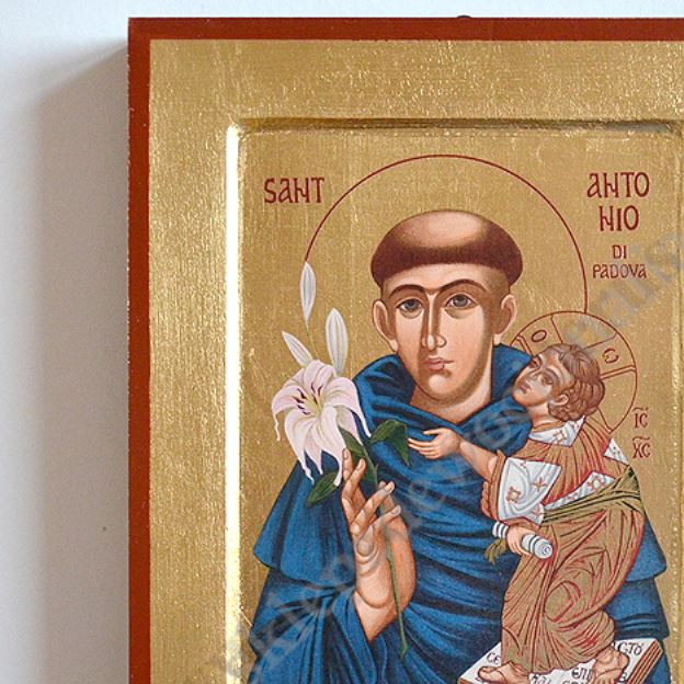 Ikona Świętego Antoniego w wymiarze 18 x 24 cm. PONIŻEJ W PRODUKTACH POWIĄZANYCH ISTNIEJE MOŻLIWOŚĆ ZAMÓWIENIA OKAZJONALNEJ DEDYKACJI NA TABLICZCE SREBRNEJ LUB ZŁOTEJ.