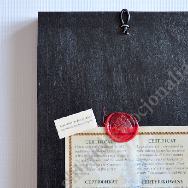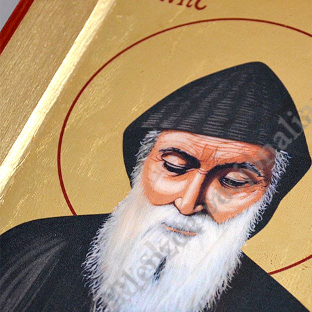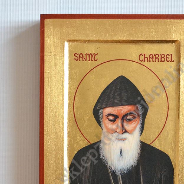 kona Świętego Charbela w wymiarze 18 x 23.5 cm. Ikona ręcznie wykonana na płótnie lnianym wklejonym w drewno. Tło ikony jest wykonane ze sproszkowanego złota. Grubość deski 2.6 cm.