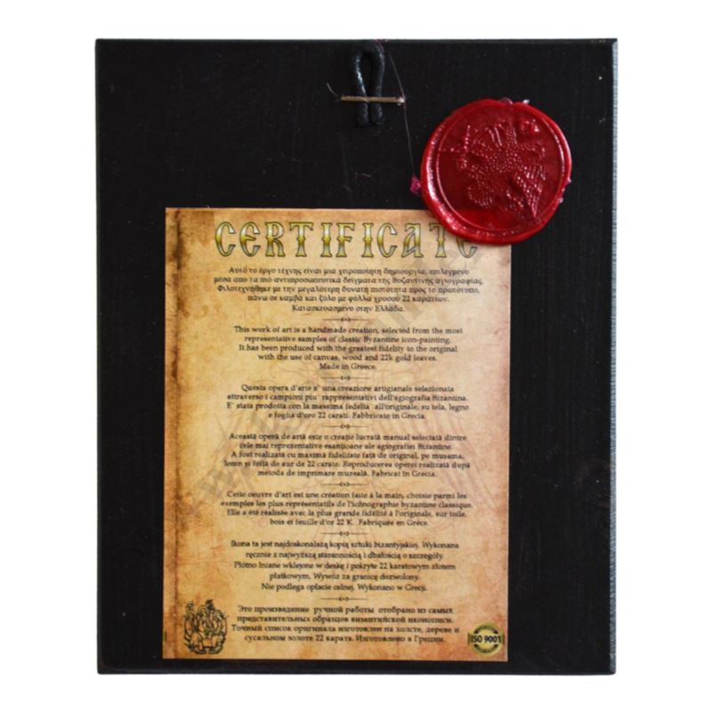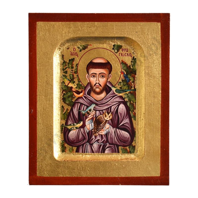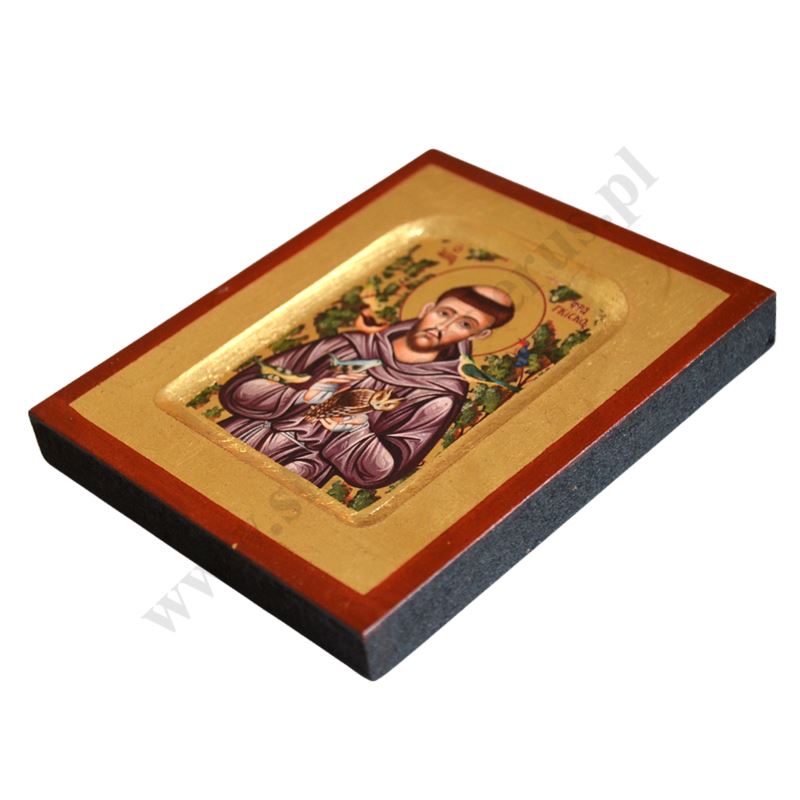Ikona przedstawiająca wizerunek Świętego Franciszka o wymiarze 10.3 x 12.5 cm. Ikona ręcznie wykonana na płótnie lnianym wklejonym w drewno. Tło ikony jest wykonane ze sproszkowanego złota. Grubość deski 1.5 cm.
