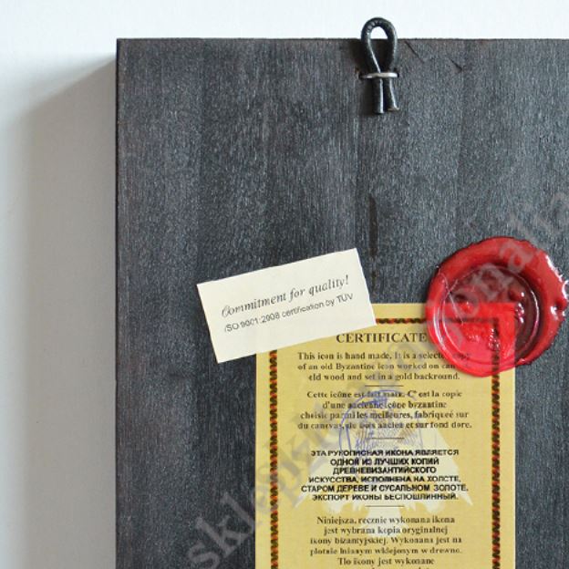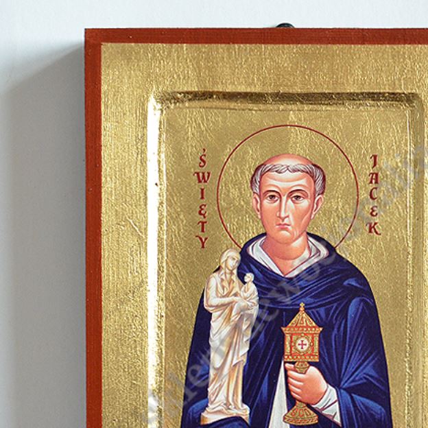 Ikona Świętego Jacka w wymiarze 14 x 18 cm. Ikona ręcznie wykonana na płótnie lnianym wklejonym w drewno. Tło ikony jest wykonane ze sproszkowanego złota. Grubość deski 2.3 cm. Ikona do powieszenia jak i postawienia.