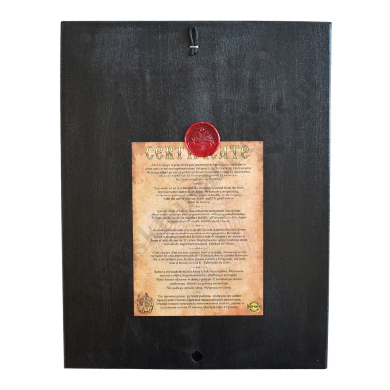 Ikona przedstawiająca Świętego Jakuba w wymiarze 24 x 31 cm. Ikona ręcznie wykonana na płótnie lnianym wklejonym w drewno. Tło ikony jest wykonane ze sproszkowanego złota. Grubość deski 2.4 cm.