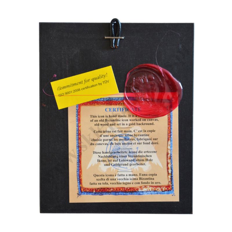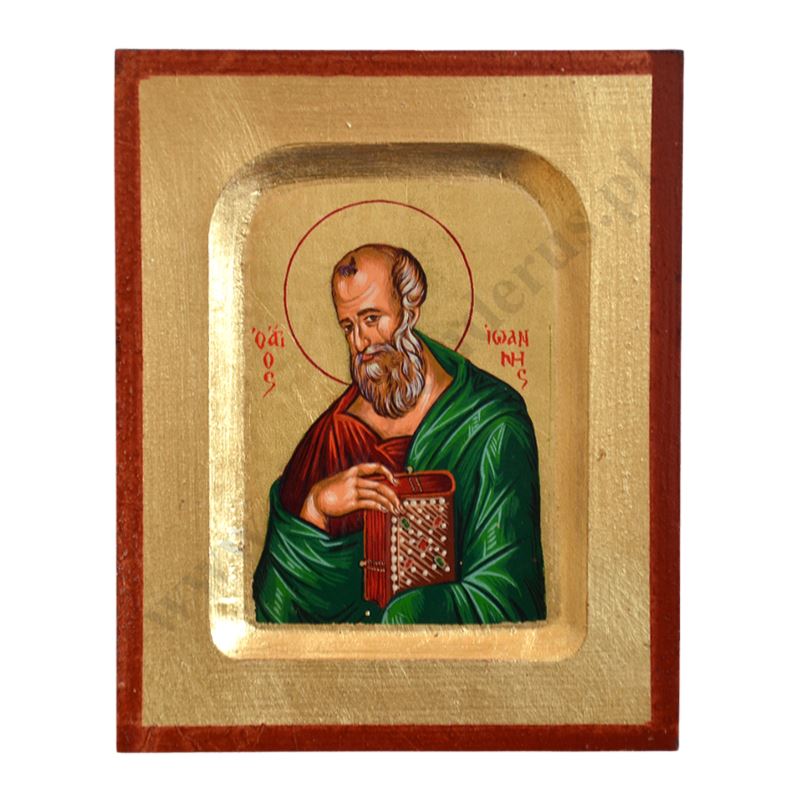 Ikona przedstawiająca Świętego Jana w wymiarze 10.2 x 12.4 cm. Ikona ręcznie wykonana na płótnie lnianym wklejonym w drewno. Tło ikony jest wykonane ze sproszkowanego złota. Grubość deski 1.7 cm.
