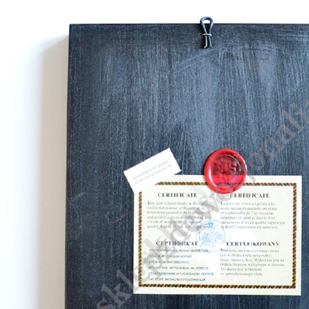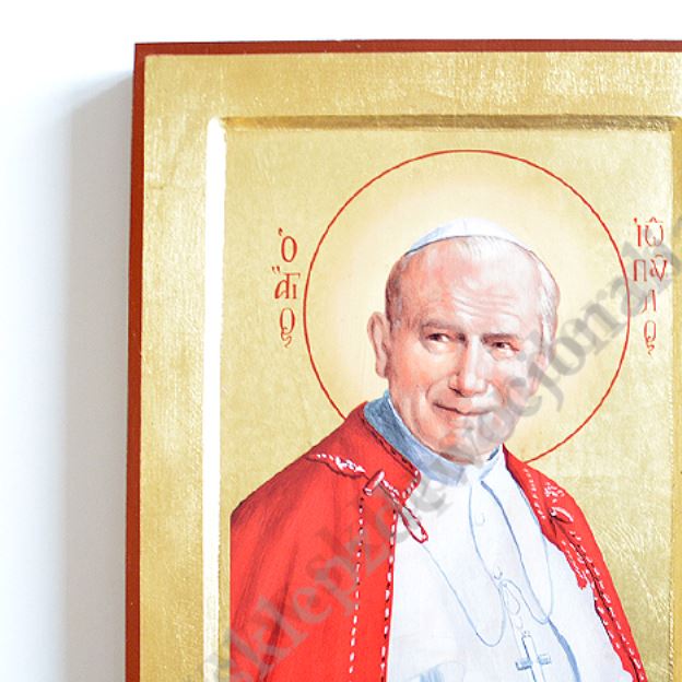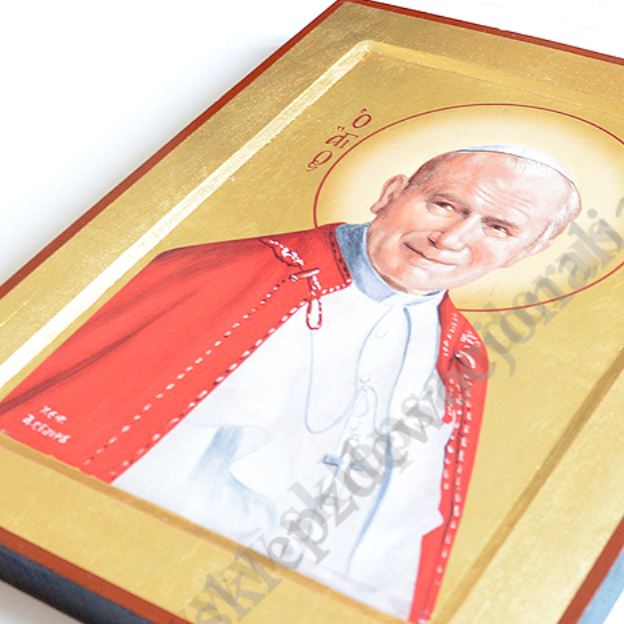 Ikona Świętego Jana Pawła II w wymiarze 24 x 31 cm. Ikona ręcznie wykonana na płótnie lnianym wklejonym w drewno. Tło ikony jest wykonane ze sproszkowanego złota. Grubość deski 2.3 cm. Ikona do powieszenia jak i postawienia.