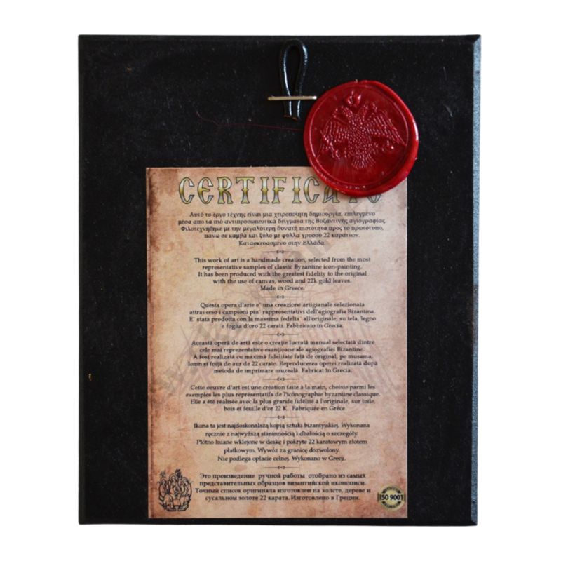 Ikona przedstawiająca Świętego Jerzego w wymiarze 10.3 x 12.5 cm. Ikona ręcznie wykonana na płótnie lnianym wklejonym w drewno. Tło ikony jest wykonane ze sproszkowanego złota. Grubość deski 1.5 cm.