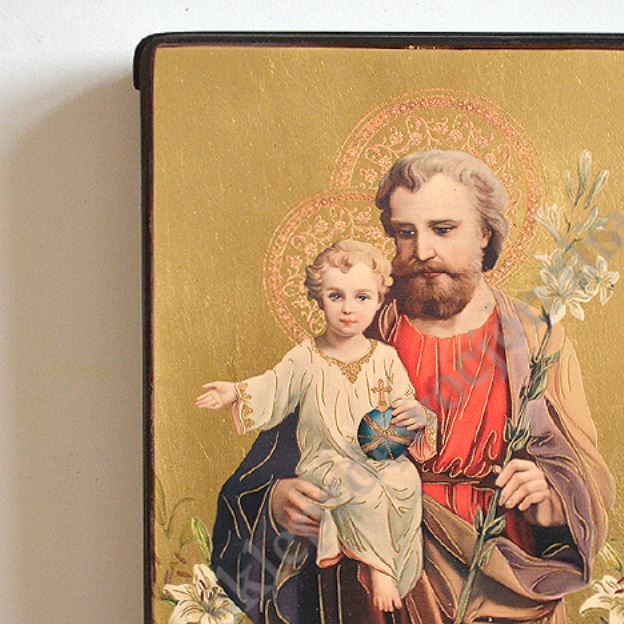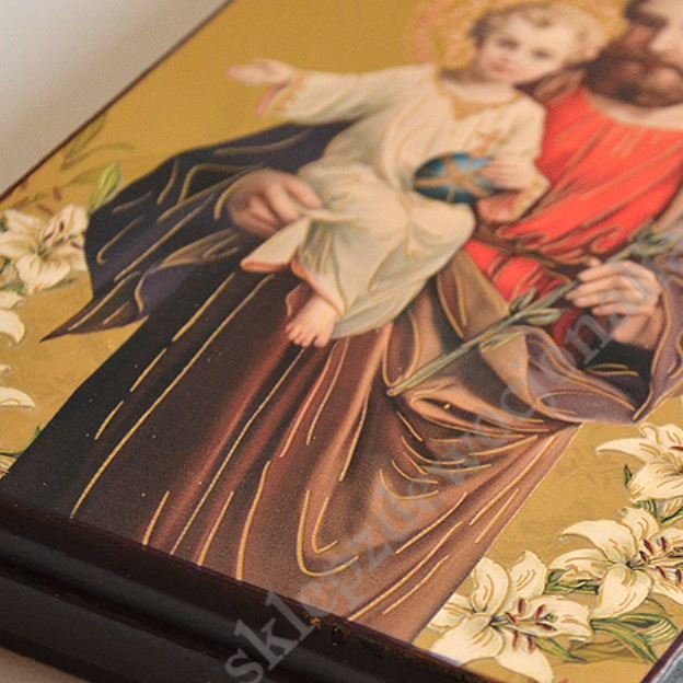 Ikona Świętego Józefa o wymiarach 11.9 x 16.8 cm, grubość deski 2.1 cm. Ikona z możliwością powieszenia lub postawienia. PONIŻEJ W PRODUKTACH POWIĄZANYCH ISTNIEJE MOŻLIWOŚĆ ZAMÓWIENIA OKAZJONALNEJ DEDYKACJI NA TABLICZCE SREBRNEJ LUB ZŁOTEJ.