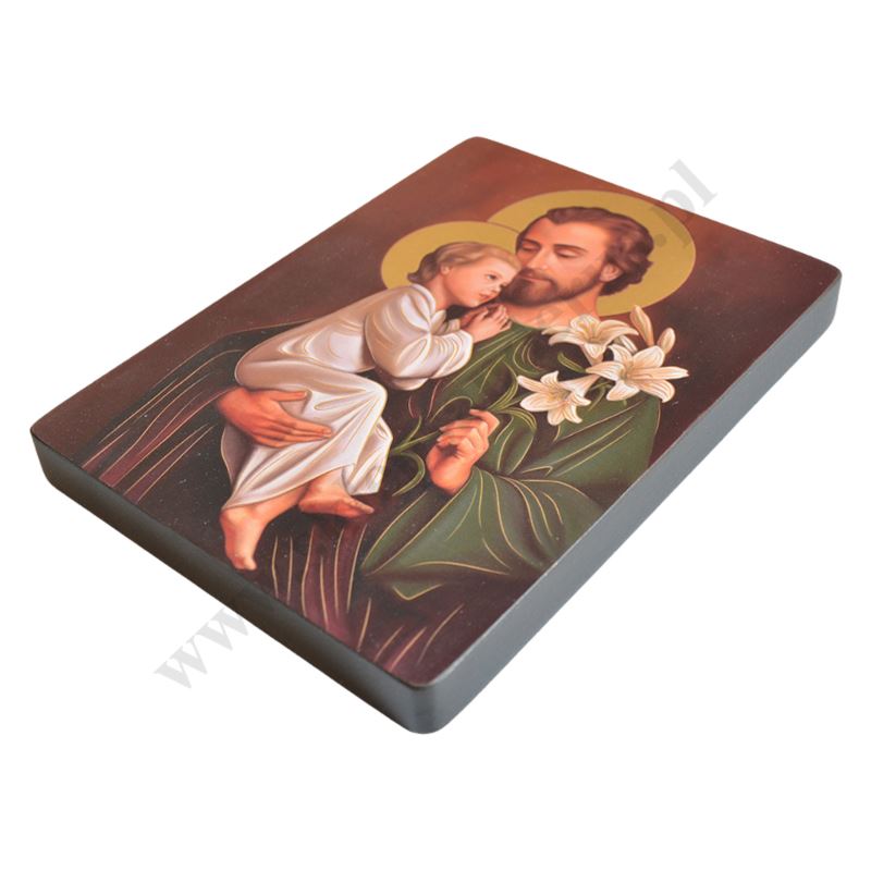 Ikona Świętego Józefa o wymiarze 17 x 23 cm i grubości 2.4 cm. PONIŻEJ W PRODUKTACH POWIĄZANYCH ISTNIEJE MOŻLIWOŚĆ ZAMÓWIENIA OKAZJONALNEJ DEDYKACJI NA TABLICZCE SREBRNEJ LUB ZŁOTEJ