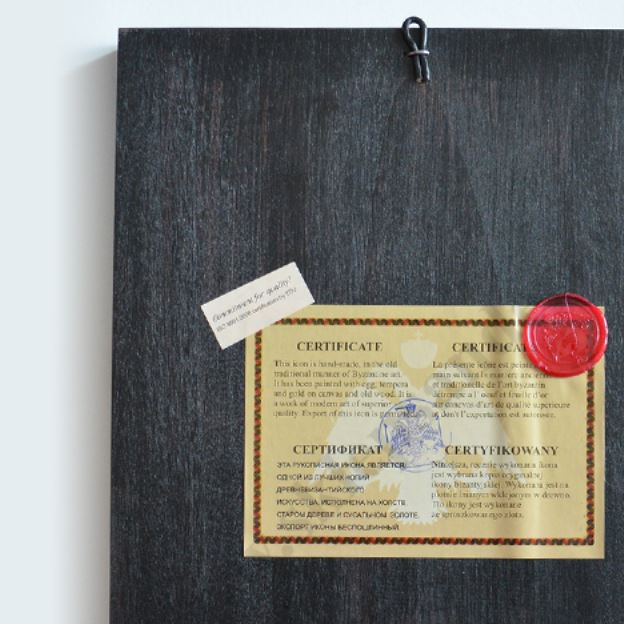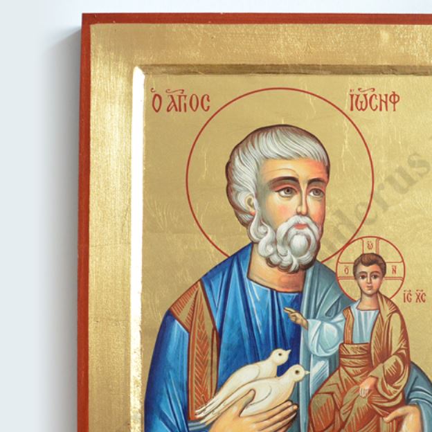 Ikona Świętego Józefa w wymiarze 24 x 31 cm. Ikona ręcznie wykonana na płótnie lnianym wklejonym w drewno. Tło ikony jest wykonane ze sproszkowanego złota. Grubość deski 2.5 cm. Ikona do powieszenia jak i postawienia.
