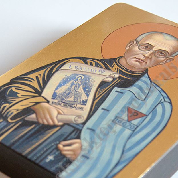 Ikona Świętego Maksymiliana Kolbe o wymiarze 12 x 16 cm i grubości 2.5 cm. PONIŻEJ W PRODUKTACH POWIĄZANYCH ISTNIEJE MOŻLIWOŚĆ ZAMÓWIENIA OKAZJONALNEJ DEDYKACJI NA TABLICZCE SREBRNEJ LUB ZŁOTEJ.