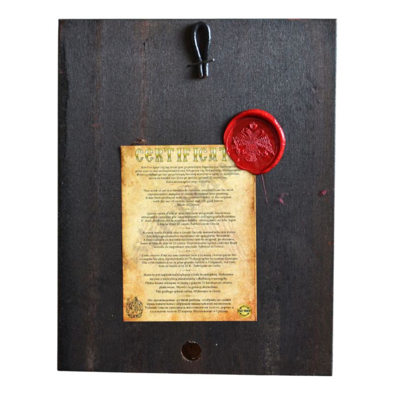 Ikona Świętego Mikołaja w wymiarze 14 x 18 cm. Ikona ręcznie wykonana na płótnie lnianym wklejonym w drewno. Tło ikony jest wykonane ze sproszkowanego złota. Grubość deski 2.3 cm. Ikona do powieszenia jak i postawienia.