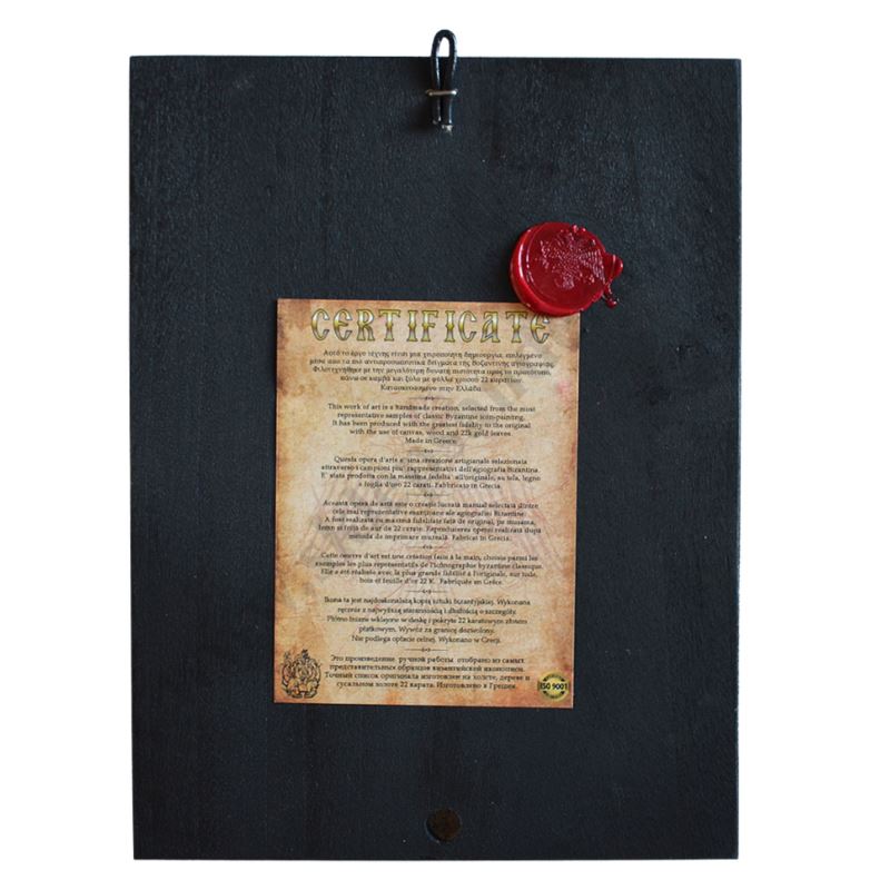 Ikona przedstawiająca wizerunek Świętego Mikołaja o wymiarze 18 x 23.5 cm. Ikona ręcznie wykonana na płótnie lnianym wklejonym w drewno. Tło ikony jest wykonane ze sproszkowanego złota. Grubość deski 2.3 cm. Ikona do powieszenia jak i postawienia.