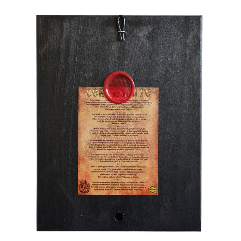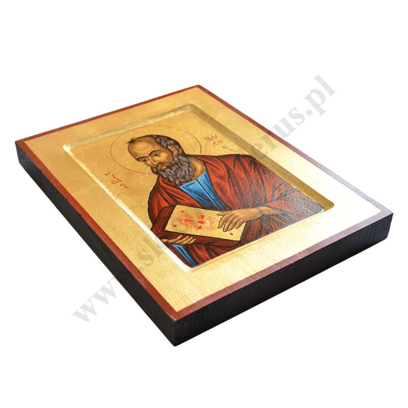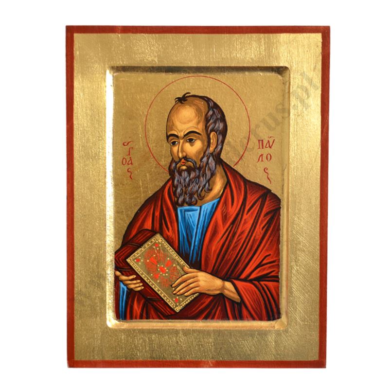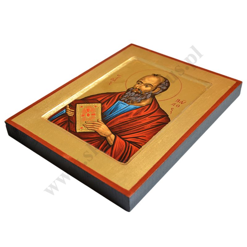 Ikona przedstawiająca Świętego Pawła w wymiarze 18 x 23.5 cm. Ikona ręcznie wykonana na płótnie lnianym wklejonym w drewno. Tło ikony jest wykonane ze sproszkowanego złota. Grubość deski 2.3 cm. Ikona do powieszenia lub postawienia.