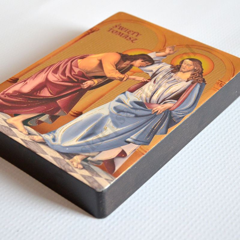 Ikona przedstawiająca wizerunek Świętego Tomasza o wymiarach 11.9 x 16 cm, grubość deski 2.4 cm. Ikona z możliwością powieszenia lub postawienia.