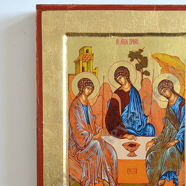 Ikona Trójcy Świętej w wymiarze 18 x 24 cm. Ikona ręcznie wykonana na płótnie lnianym wklejonym w drewno. Tło ikony jest wykonane ze sproszkowanego złota. Grubość deski 2.6 cm.