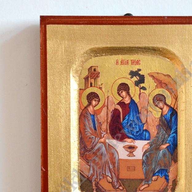 Ikona Trójcy Świętej - Rublowa w wymiarze 10.5 x 12.5 cm. PONIŻEJ W PRODUKTACH POWIĄZANYCH ISTNIEJE MOŻLIWOŚĆ ZAMÓWIENIA OKAZJONALNEJ DEDYKACJI NA TABLICZCE SREBRNEJ LUB ZŁOTEJ.