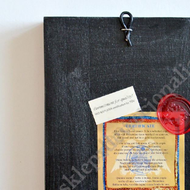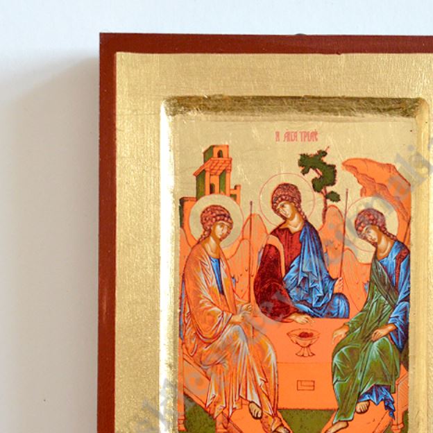 Ikona Trójcy Świętej - Rublowa w wymiarze 14 x 18 cm. Ikona ręcznie wykonana na płótnie lnianym wklejonym w drewno. Tło ikony jest wykonane ze sproszkowanego złota. Grubość deski 1.5 cm. Ikona do powieszenia jak i postawienia.