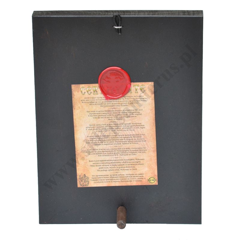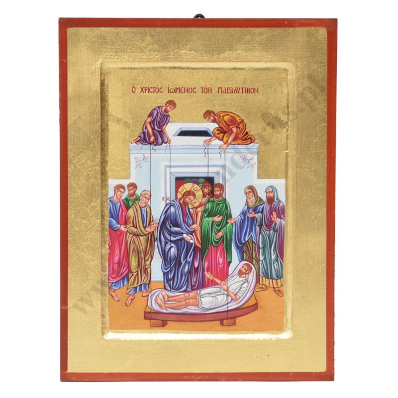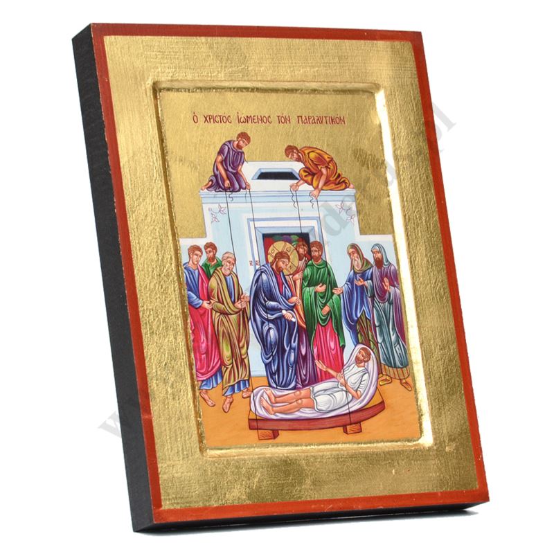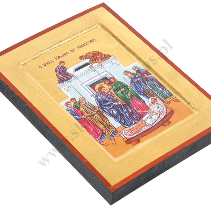 Ikona przedstawiająca scenę Uzdrowienie Paralityka w wymiarze 18 x 23.5 cm. Ikona ręcznie wykonana na płótnie lnianym wklejonym w drewno. Tło ikony jest wykonane ze sproszkowanego złota. Grubość deski 2.3 cm. Ikona do powieszenia jak i postawienia.