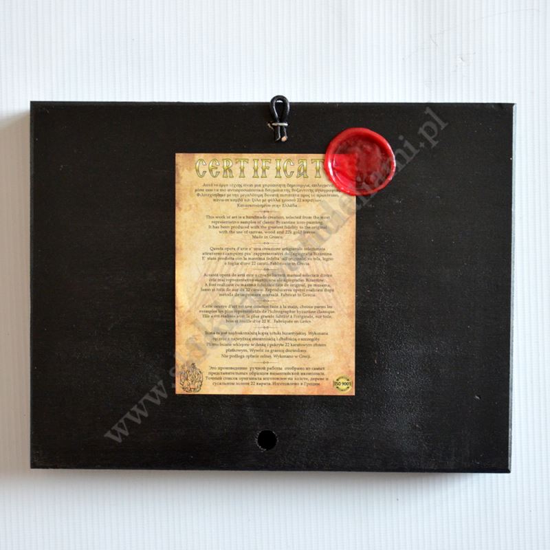 Ikona Wesele w Kanie Galilejskiej w wymiarze 23.5 x 18 cm. Ikona ręcznie wykonana na płótnie lnianym wklejonym w drewno. Tło ikony jest wykonane ze sproszkowanego złota. Grubość deski 2.3 cm. Ikona do powieszenia jak i postawienia.