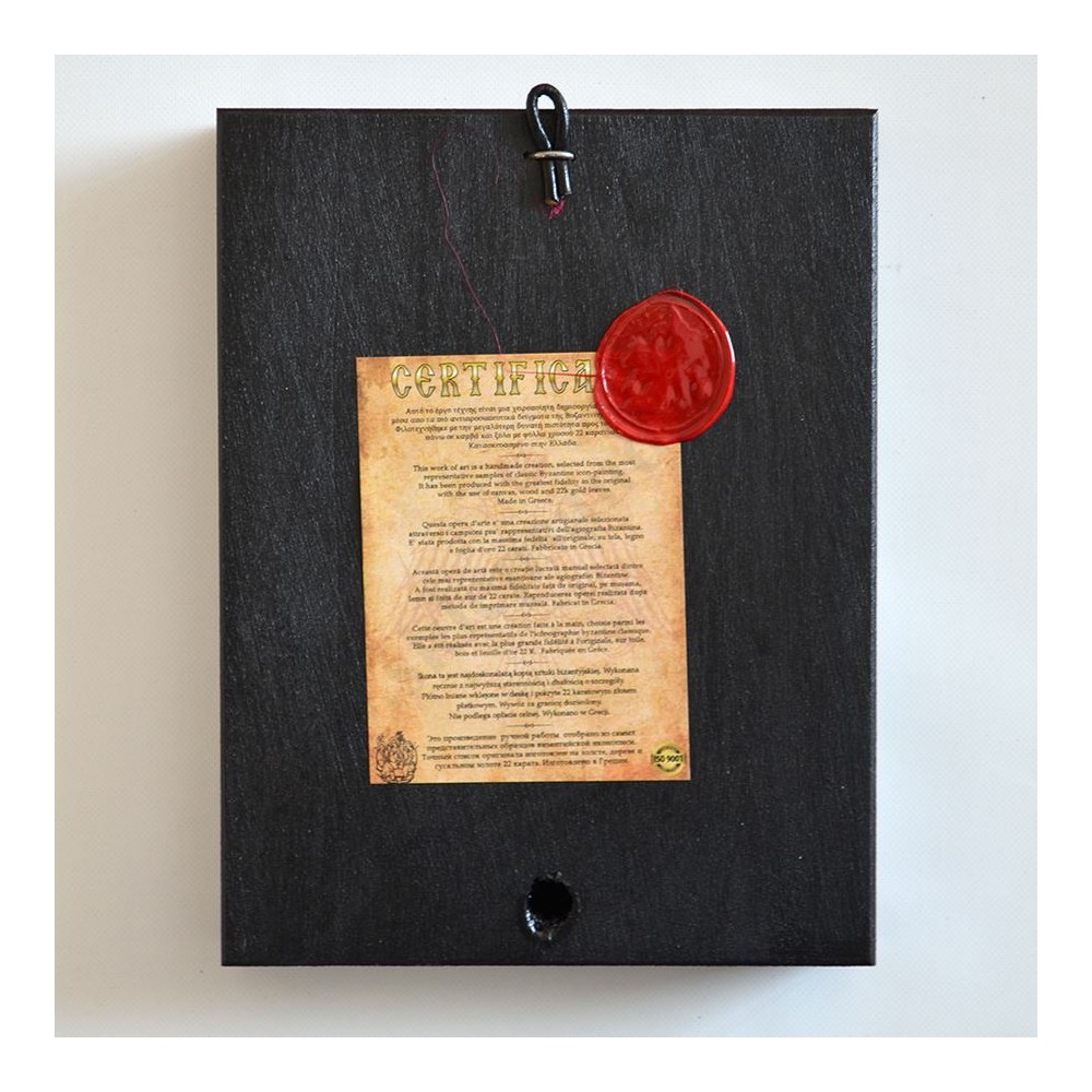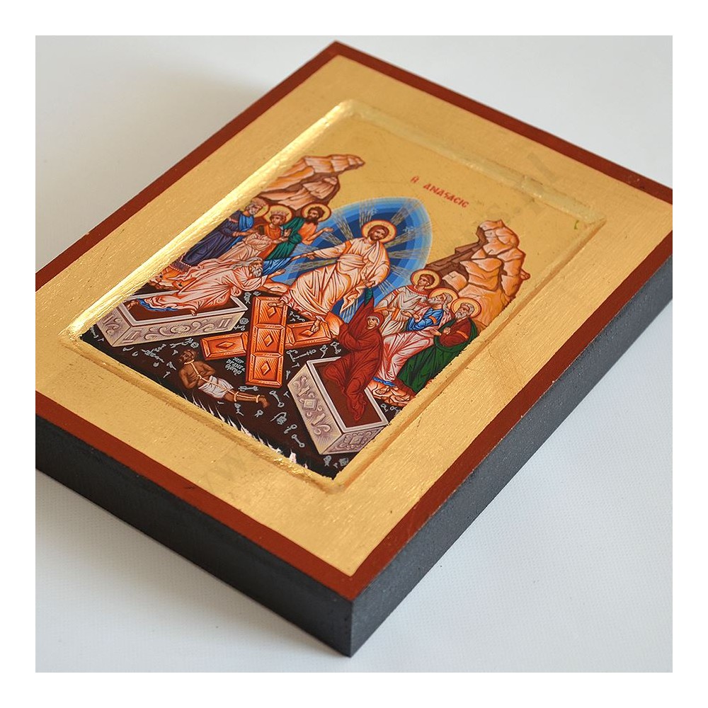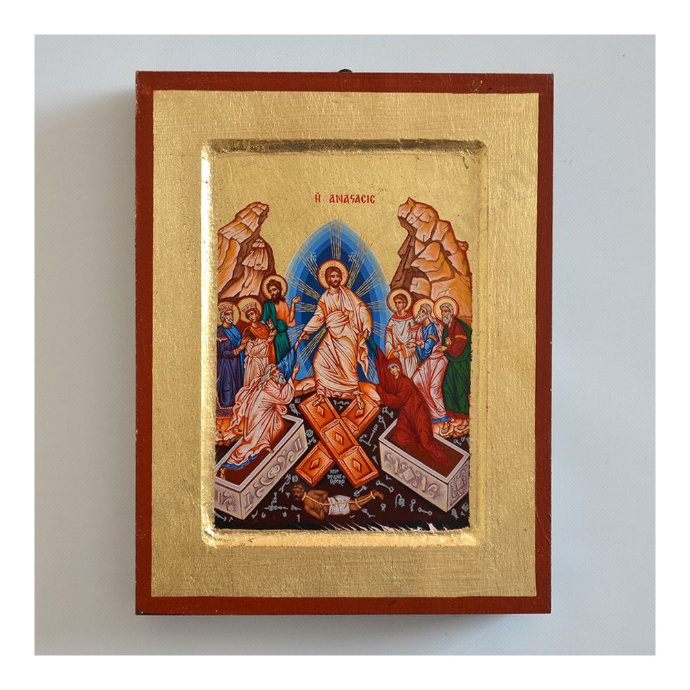 Ikona przedstawiająca wizerunek Zmartwychwstania Pana Jezusa w wymiarze 14 x 18 cm. Ikona ręcznie wykonana na płótnie lnianym wklejonym w drewno. Grubość deski 2.4 cm. Ikona do powieszenia jak i postawienia.