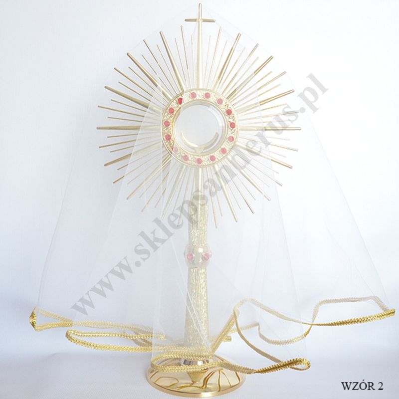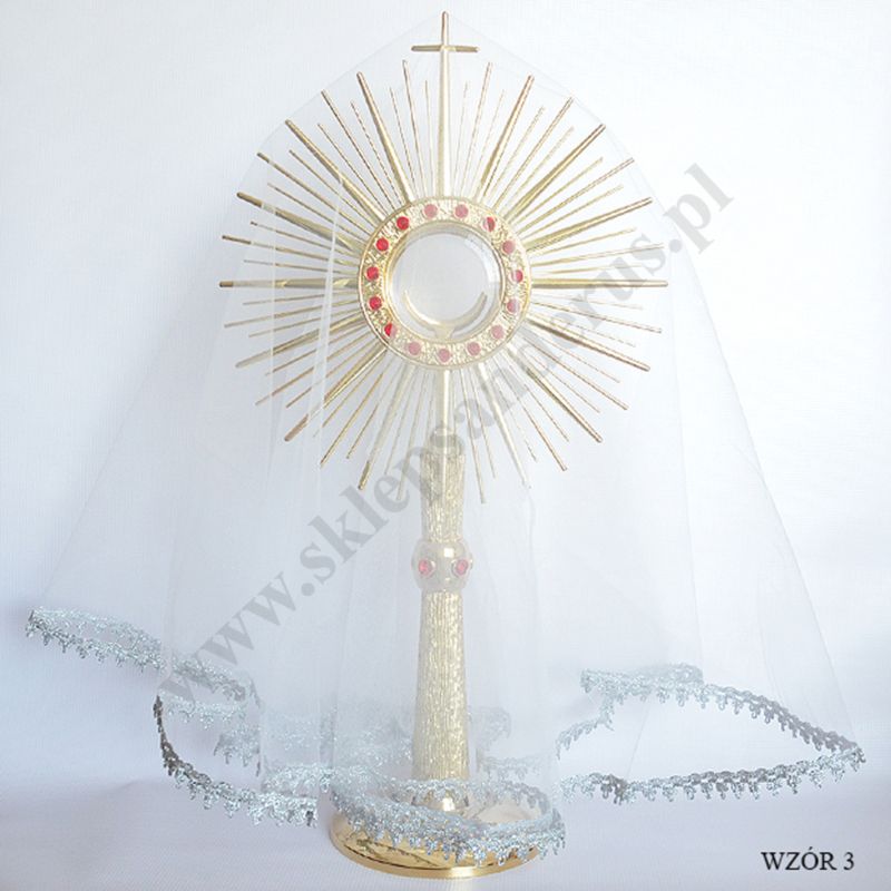 Mały welon tiulowy na monstrancję, wysokość welonu 45 cm. Dostępny w trzech kolorach lamówki białym, złotym lub srebrnym. Monstrancja zaprezentowana na zdjęciu nie podlega ofercie.